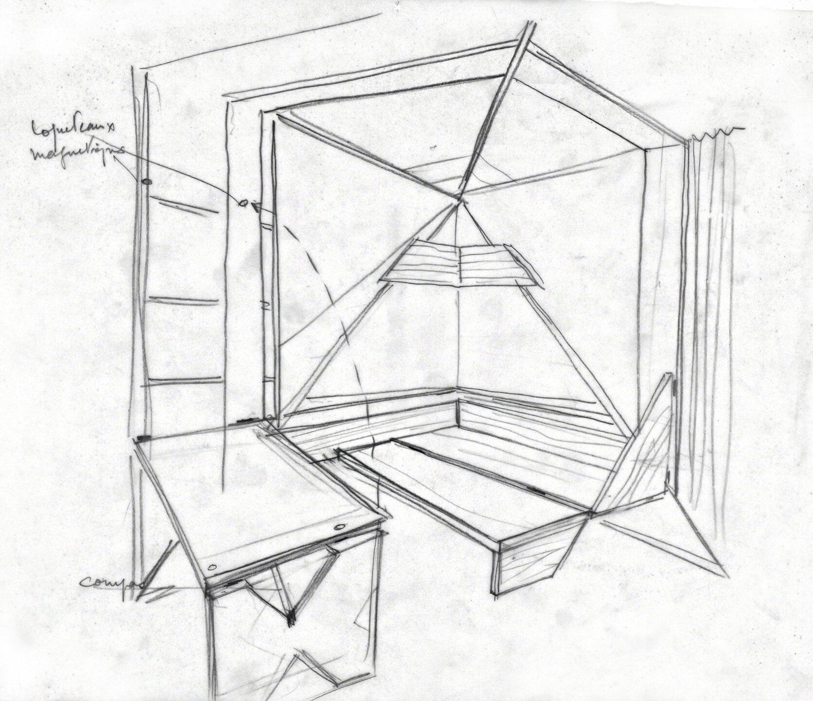 Le projet termina vainqueur d'un concours lancé par le Centre Technique du Bois. Un protype échelle 1 fut réalisé sans suite de commercialisation. Ce projet d'orientation minimaliste propose également un mobilier dans le même esprit réalisé en panneaux de multiplis.