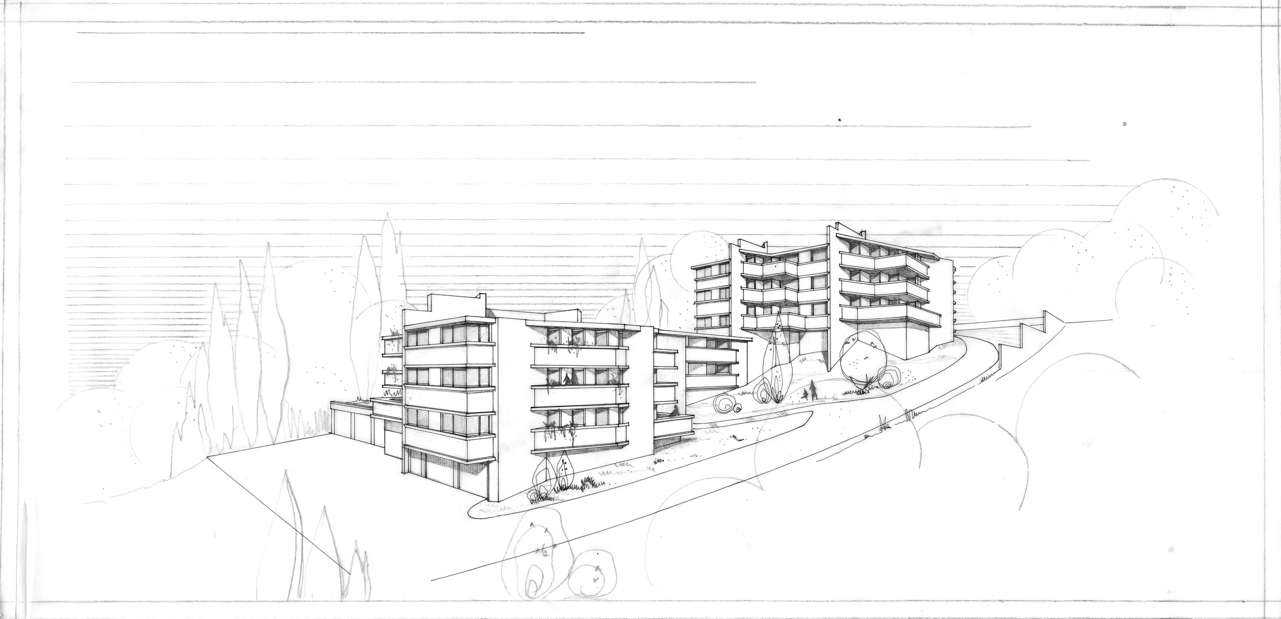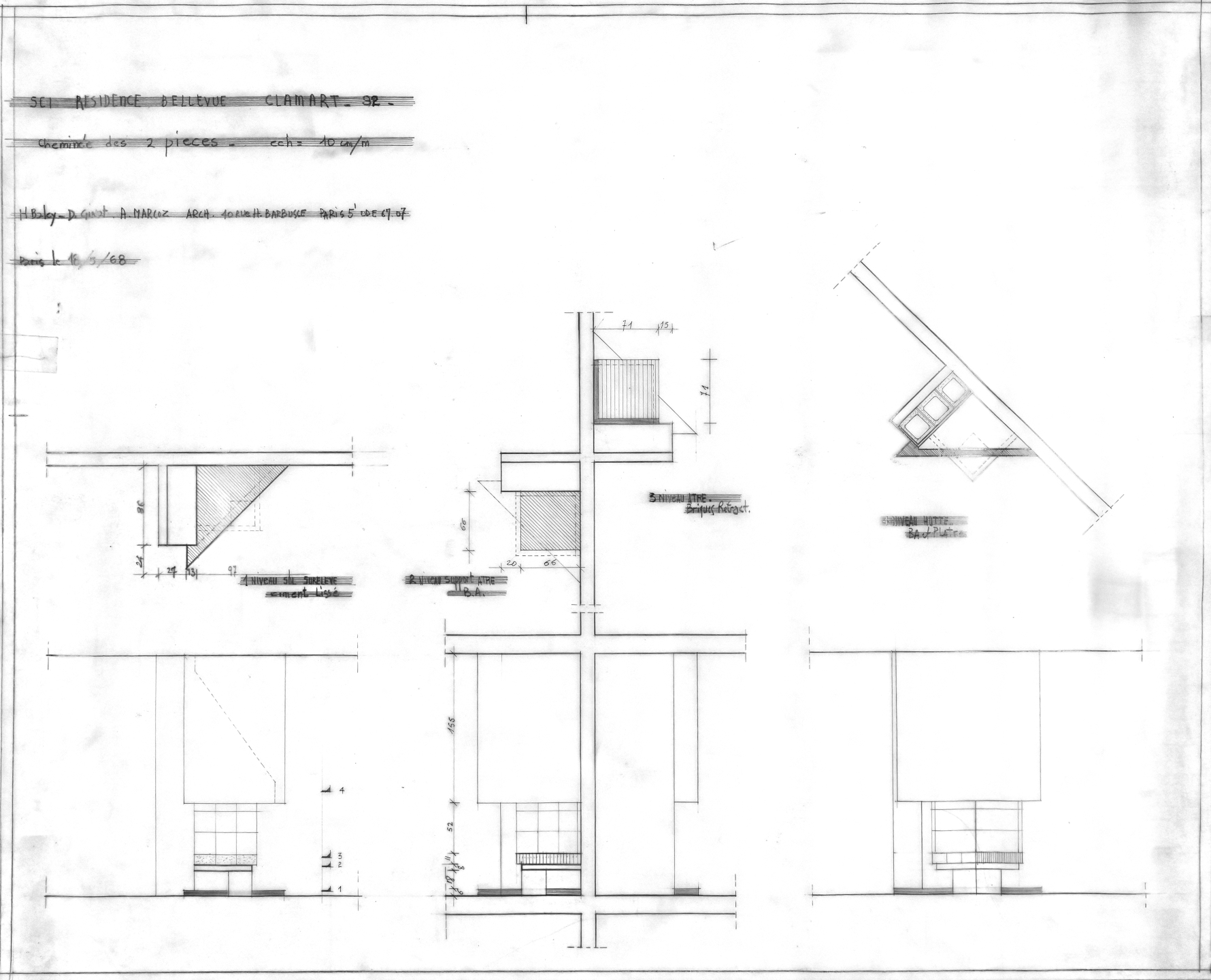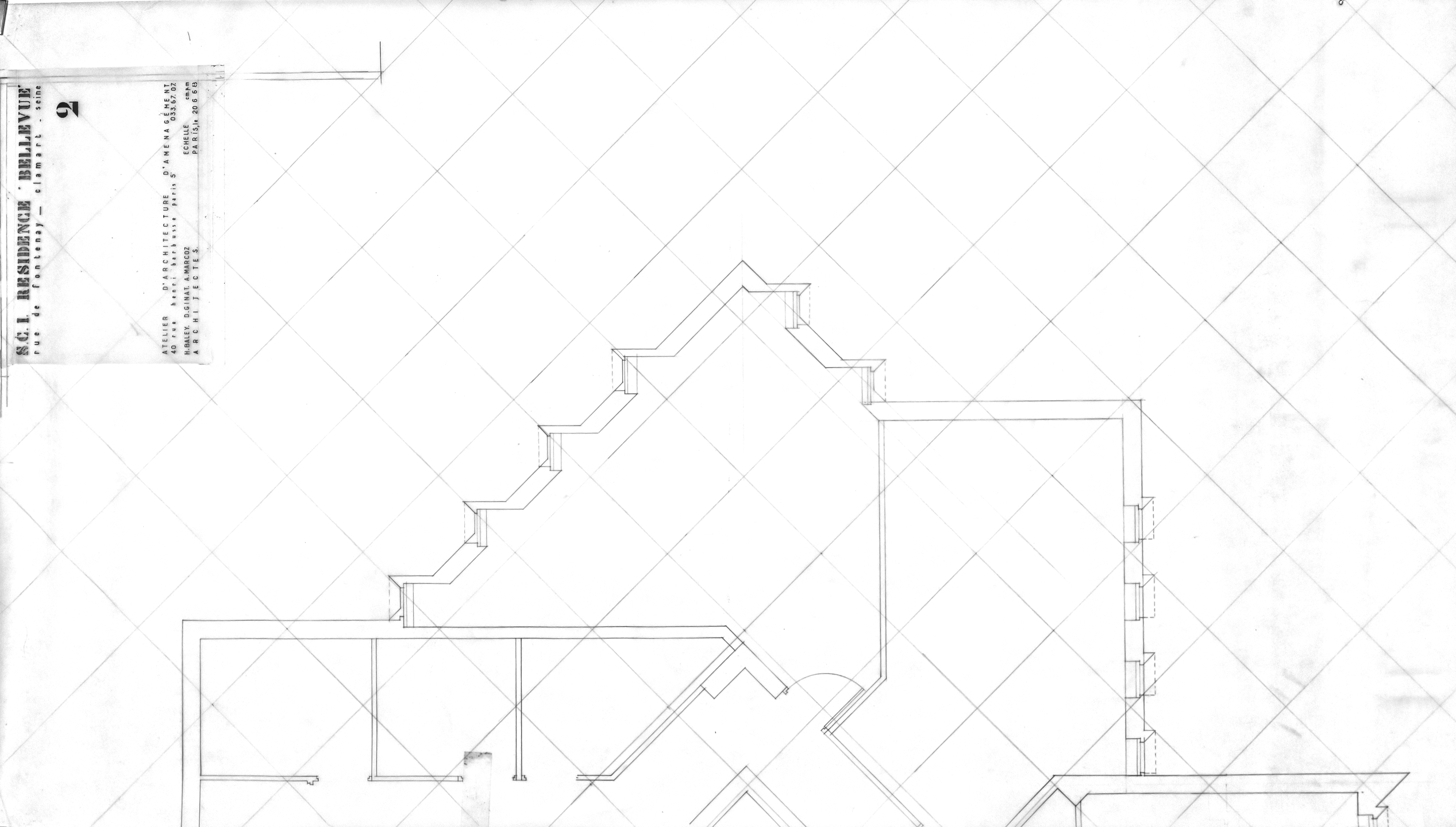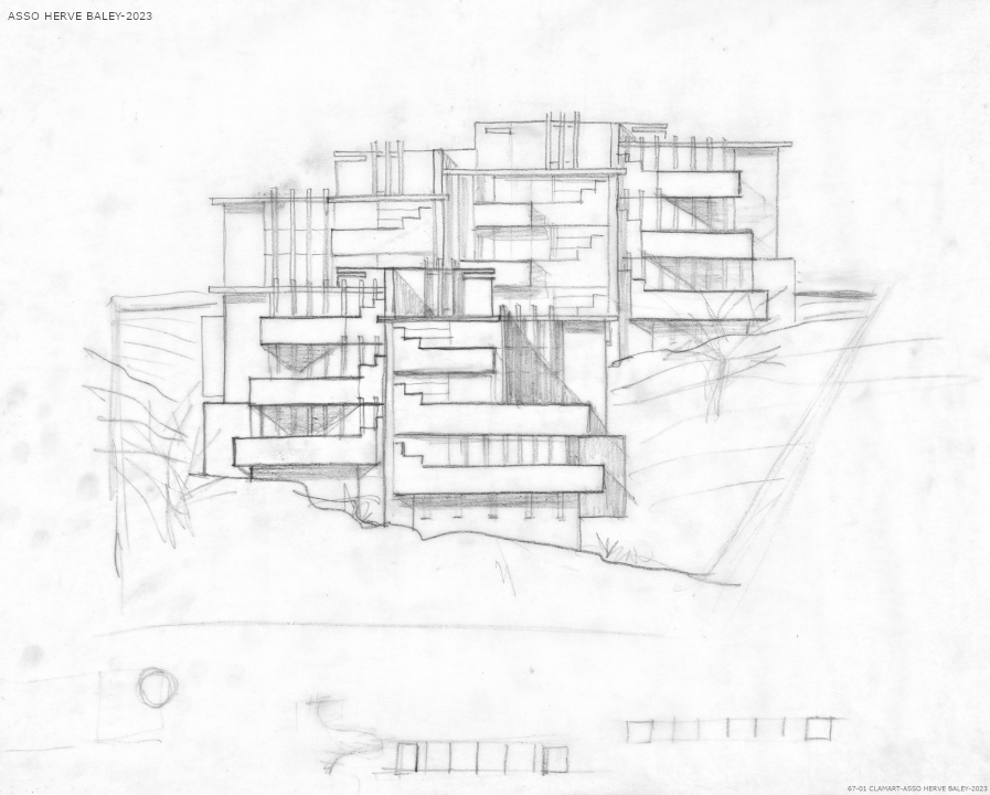 La résidence Bellevue a fait l'objet de plusieurs esquisse avant d'aboutir à sa formalisation définitive. Elle s'inscrit dans la pente du terrain tous les appartements bénéficiant d'une vue sur l'horizon parisien. Les appartements se déploient autour des trois escaliers hélicoïdaux afin de bénéficier tous d'une double exposition. Tous les détails ont été dessiné (grilles, sigle de la résidence, etc... Par un jeu subtil d'imbrication le volume général reste discret. Une seconde résidence (Dossier 71-01) devait être réalisée sur une parcelle voisine mais ne vit jamais le jour suite à des blocages administratifs. Le formalisme inspira Jean Renaudie pour des logements à Ivry-sur-Seine.