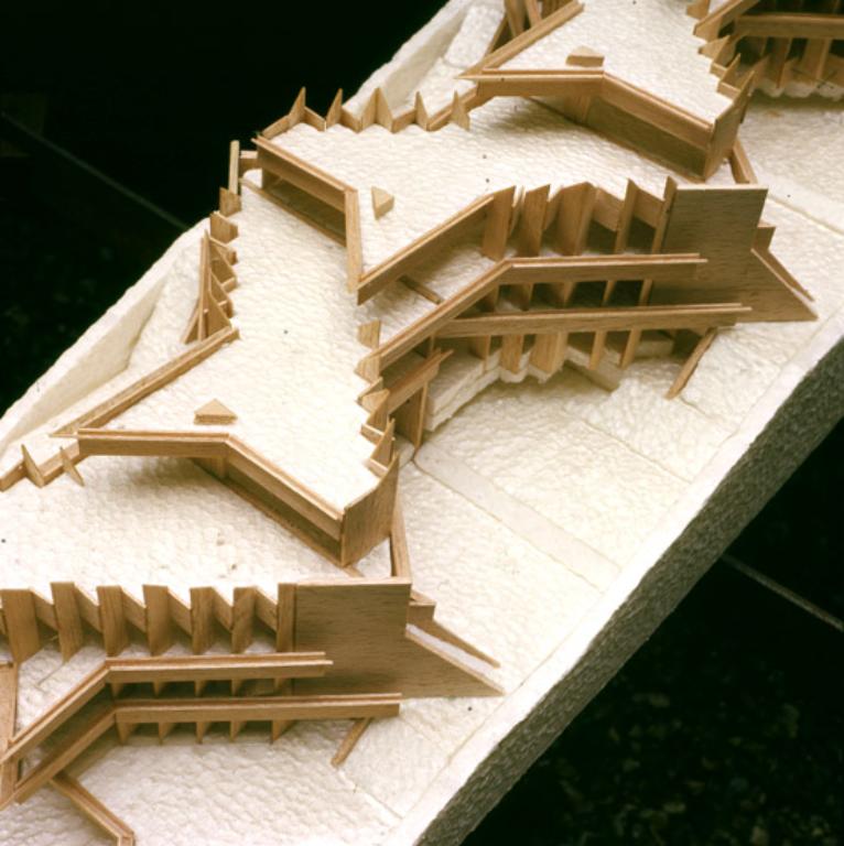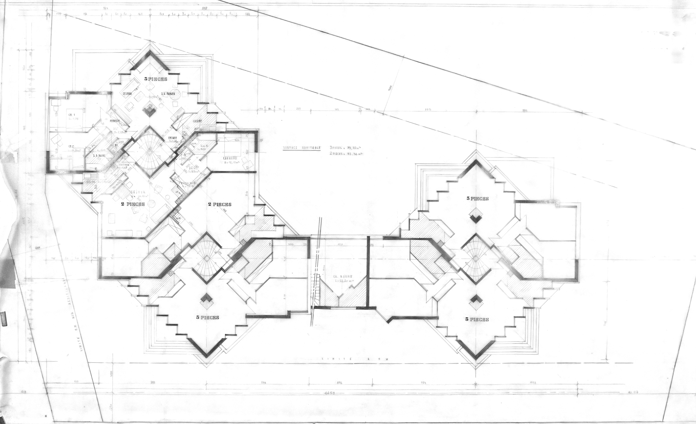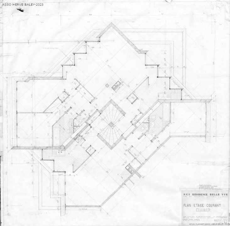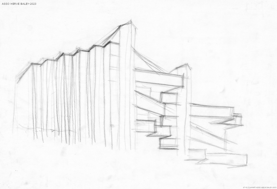 La résidence Bellevue a fait l'objet de plusieurs esquisse avant d'aboutir à sa formalisation définitive. Elle s'inscrit dans la pente du terrain tous les appartements bénéficiant d'une vue sur l'horizon parisien. Les appartements se déploient autour des trois escaliers hélicoïdaux afin de bénéficier tous d'une double exposition. Tous les détails ont été dessiné (grilles, sigle de la résidence, etc... Par un jeu subtil d'imbrication le volume général reste discret. Une seconde résidence (Dossier 71-01) devait être réalisée sur une parcelle voisine mais ne vit jamais le jour suite à des blocages administratifs. Le formalisme inspira Jean Renaudie pour des logements à Ivry-sur-Seine.